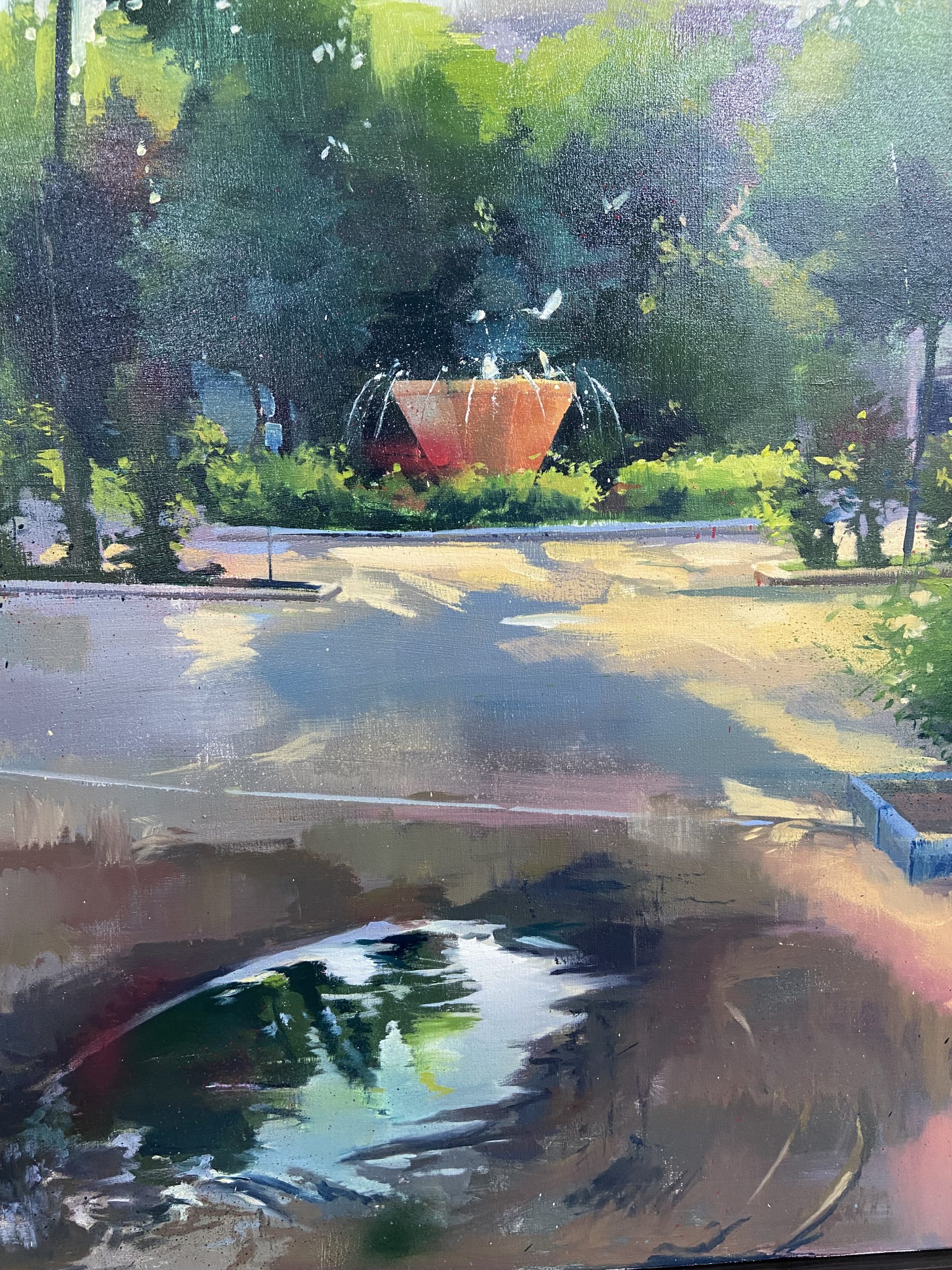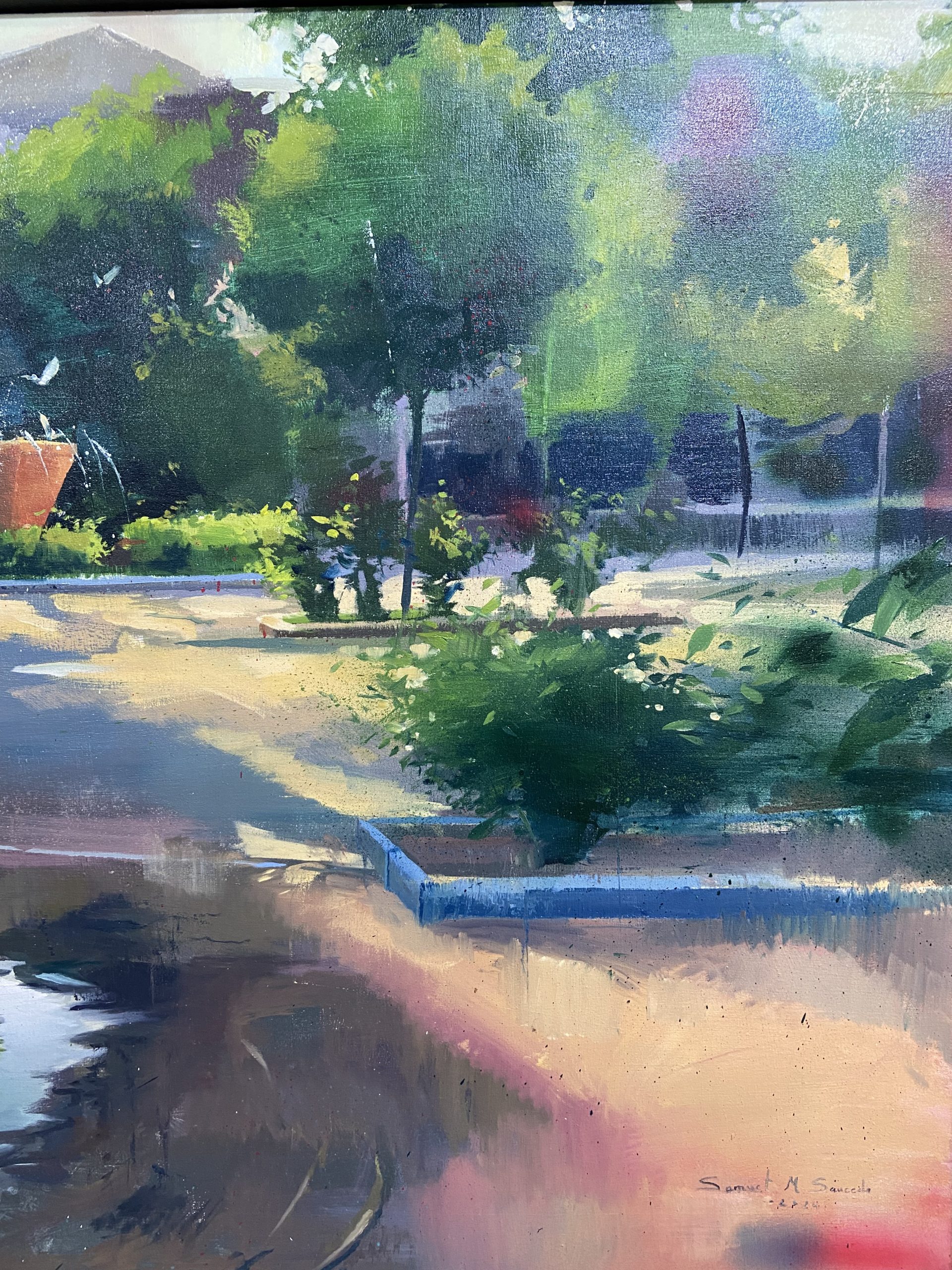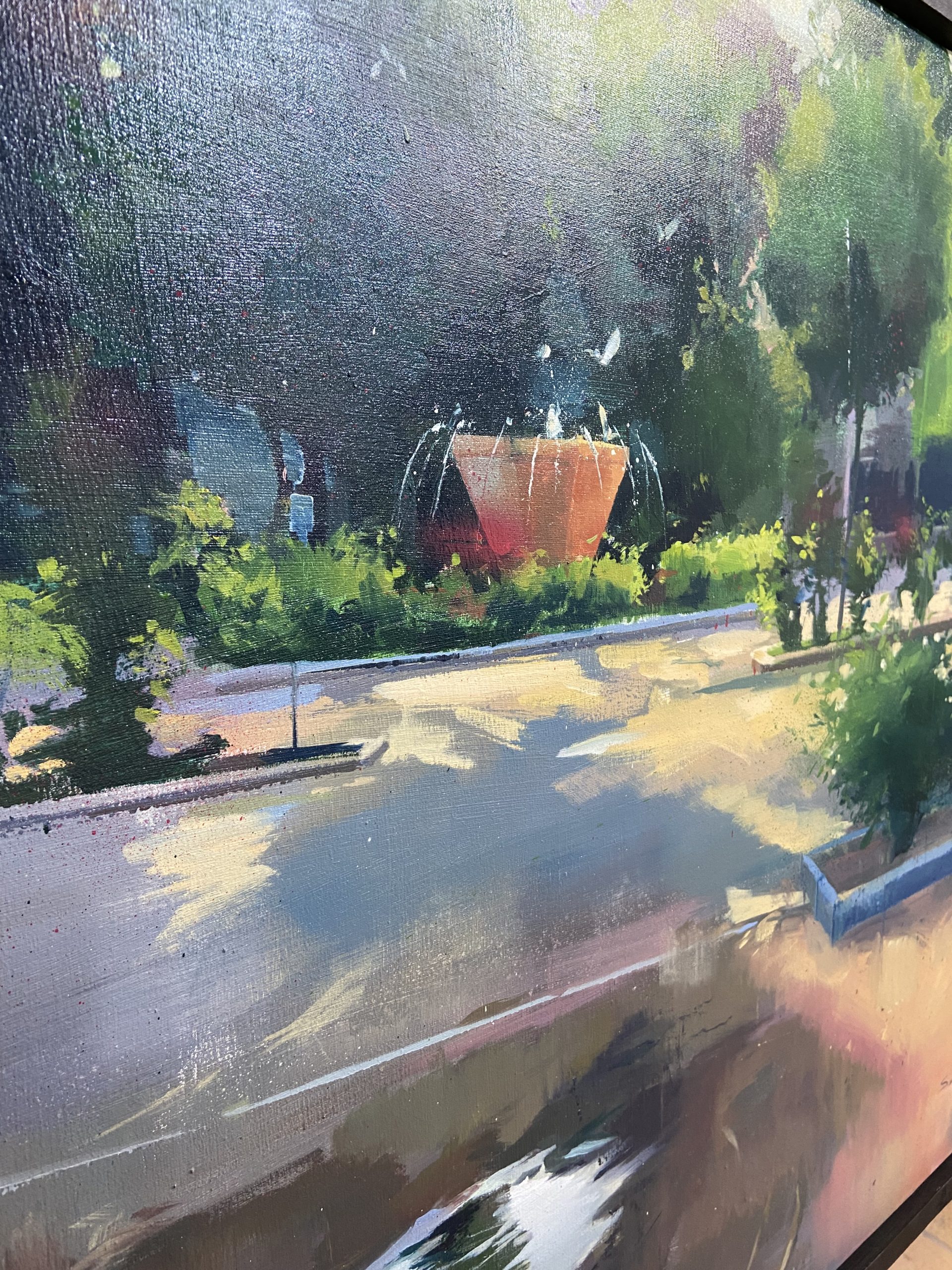 «Luz en la Fuente de Herencia» no es simplemente un estudio de la luz y la sombra; es una pintura que invita al espectador a detenerse y apreciar la naturaleza urbana en su forma más pura. Captura el momento efímero de un amanecer, donde el entorno se llena de vida gracias a los primeros rayos de sol. Por un lado, la luz es un elemento en constante movimiento; por otro lado, la quietud del entorno urbano crea un equilibrio visual que calma el alma. Este contraste genera una armonía que invita a la contemplación.